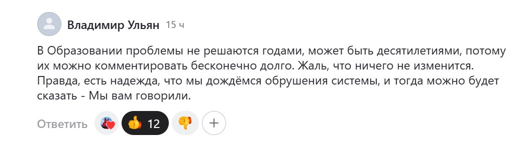 Итак, продолжаем разговор про молодого депутата и учителя по совместительству Александра Волобуева. Алтайский край. Начало читайте здесь- А про первый опыт работы учителем и почему не получилось, писали вот здесь. Главное, что это правда. А теперь это надо уметь фильтровать, сами знаете. Да и не все говорят эту правду про учительские проблемы, поскольку проще делать вид, что их нет. А мы по-тихому да по-умному всё продвигаем, пока вам недосуг вникать. Или наши люди любят, чтобы само рассосалось, но так не будет. Новые времена. Надо добиваться по факту. Поэтому, таким историям будем давать огласку. И вот сегодня два мнения. Разных, но оба подписчика по-своему правы. Но первому ставят лайки, а второму нет. Почему? Обратила на это внимание. Читаем комментарии и разбираемся в примерах. Да, если уйдут из школы учителя, которые ещё там держатся, то сш колой будет швах, это понятно. И тогда люди, которые добиваются развала школьной системы, делая вид, что делают её новой и соответствующей