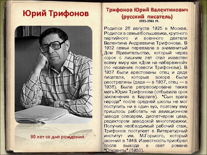 Юрий Валентинович Трифонов — один из крупнейших советских писателей второй половины XX века, мастер психологической прозы. Его произведения, такие как «Студенты», «Обмен», «Дом на набережной» и «Старик», раскрывают сложные человеческие отношения и нравственные дилеммы. Но за пределами его книг скрывается множество увлекательных и малоизвестных фактов из его насыщенной биографии.