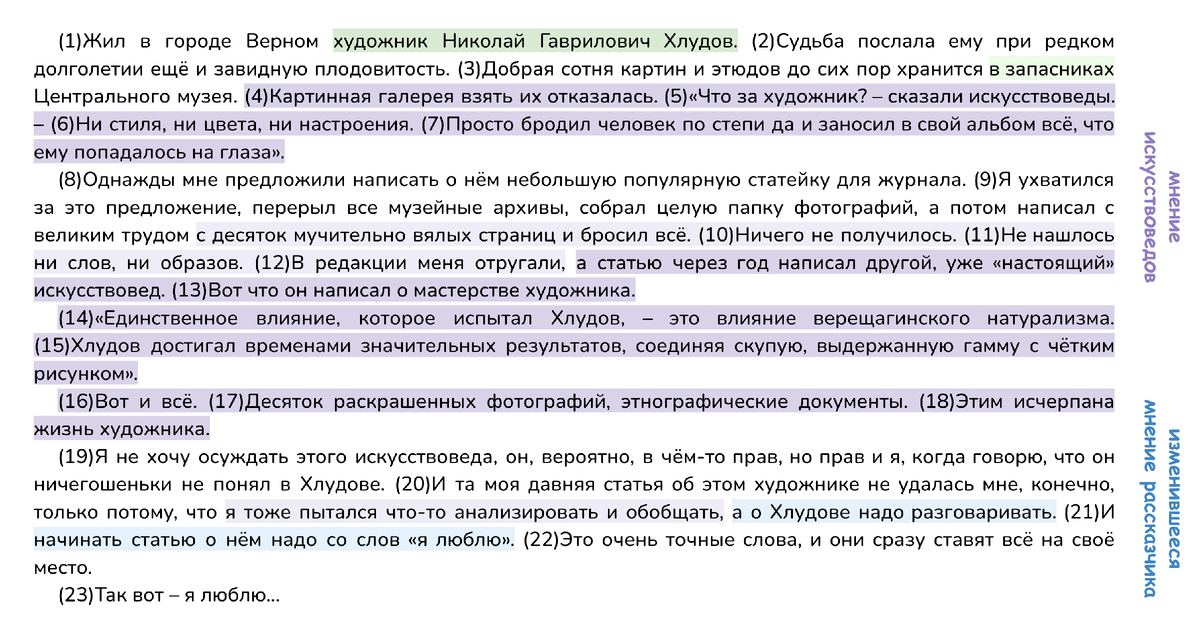 Открытый банк заданий ФИПИ, 2025 13.2 Напишите сочинение-рассуждение. Объясните, как Вы понимаете смысл фрагмента текста: «Ведь он рисовал не только степи и горы, но и ту степень изумления и восторга, которые ощущает каждый, кто первый раз попадает в этот необычайный мир. И именно поэтому каждое его полотно ликует и смеётся от радости». Смысл приведённого фрагмента текста Ю.О. Домбровского я понимаю так: пейзажи Хлудова вызывают в рассказчике восхищение своей самобытностью и яркостью красок, но увидеть силу таланта может только тот, кто способен разглядеть чувства, заложенные в картинах. Приведу примеры из текста, чтобы подтвердить свою мысль. Так, рассказчик признаётся в том, что в прошлом он не смог написать достойную статью о творчестве Хлудова, потому что он пытался лишь обобщить заметки о художнике (предложения 19, 20). Не получилось живо и красочно выразить суть творчества живописца и у «настоящих искусствоведов» (предложения 4-7, 12-18). Итак, поверхностный подход, нежелание по