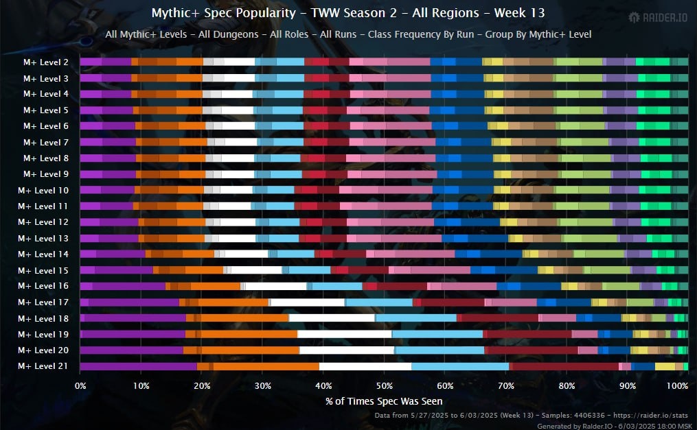 10 из 13 классов, завершивших +21 ключ - TWW Сезон 2 Mythic+ Рейтинги Неделя 13