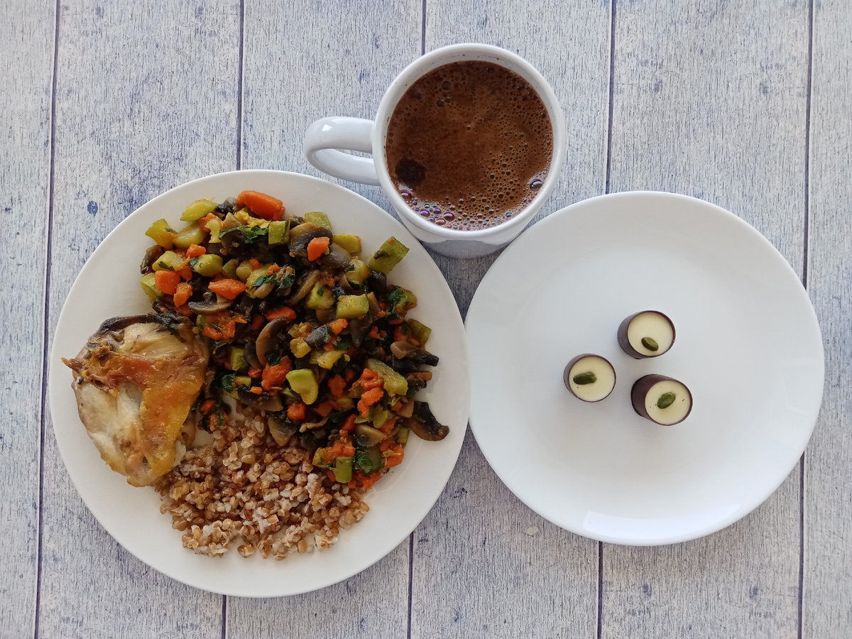 Завтрак. В кои-то веки без яиц. Доедала то, что было в холодильнике. Овощное рагу, куриное бедро и ложка булгура. Зафиналила завтрак кофе и конфетами.