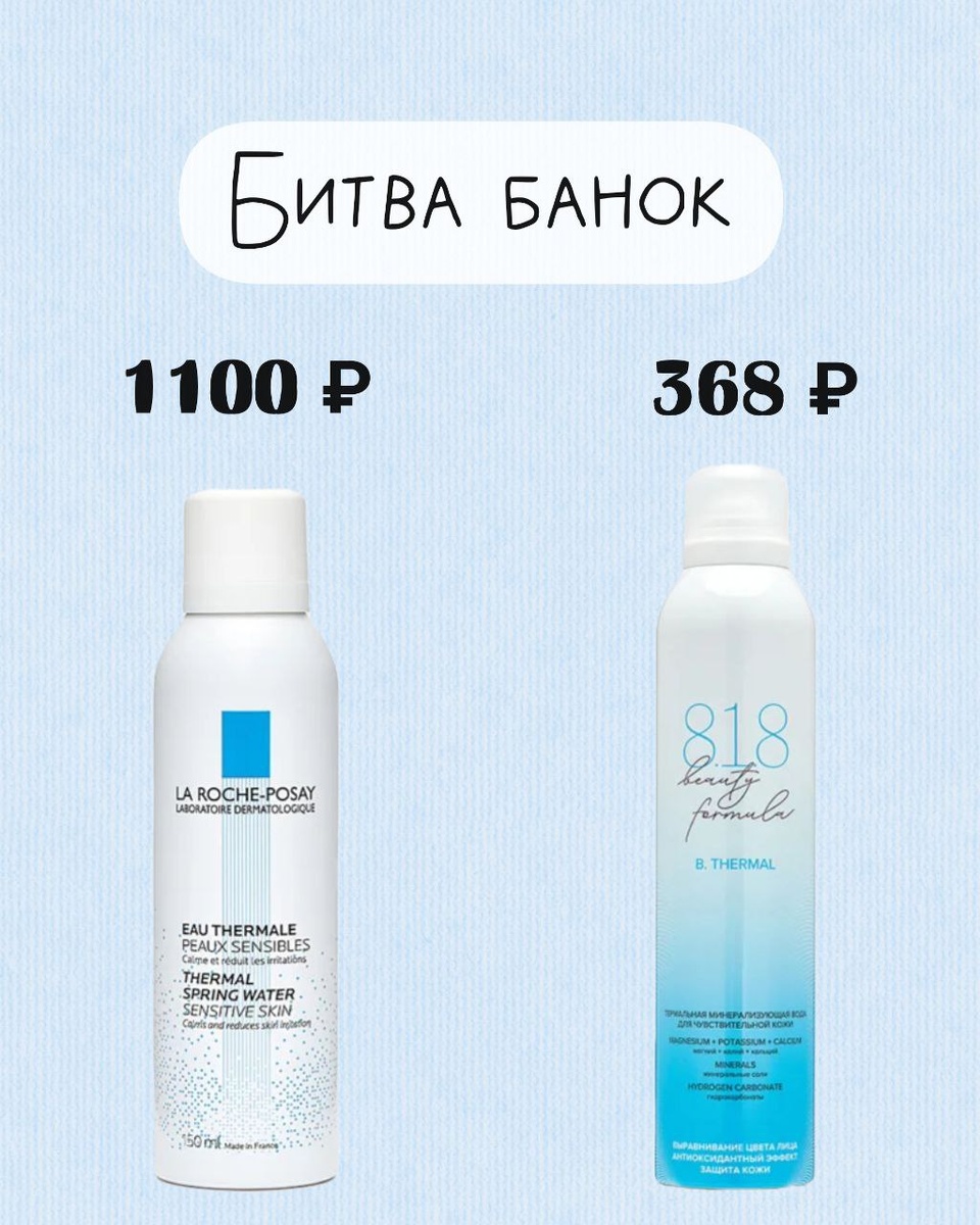Битва банок: стоит ли тратить денежки на дорогую термалку? Долго ли, коротко ли, но я решилась. Купила две термальные воды: одну французскую, с известным именем La Roche Posay и прайсом 1100₽, другую, от нашего российского бренда 8.1.8. Beauty Formula за 368₽. И знаете что? Различия слишком малы У 818 Beauty в составе: магний, калий, кальций, железо и даже селен. Минералы, которые реально работают: успокаивают, увлажняют, защищают от стресса и даже немного освежают цвет лица У La Roche-Posay — ставка на селен (его больше), плюс медь и цинк для жирной и проблемной кожи. Отлично, если боретесь с воспалениями, акне, розацеа Обе термалки универсальны, отлично фиксирует макияж, не липнут и даёт лёгкую вуаль свежести. И ту, и ту, можно использовать для чувствительной кожи. Но у нашей, цена как воздух в горах: свободная и доступная Вывод? Если у вас нет острого дерматологического запроса — смело берите 818 #нашелучше