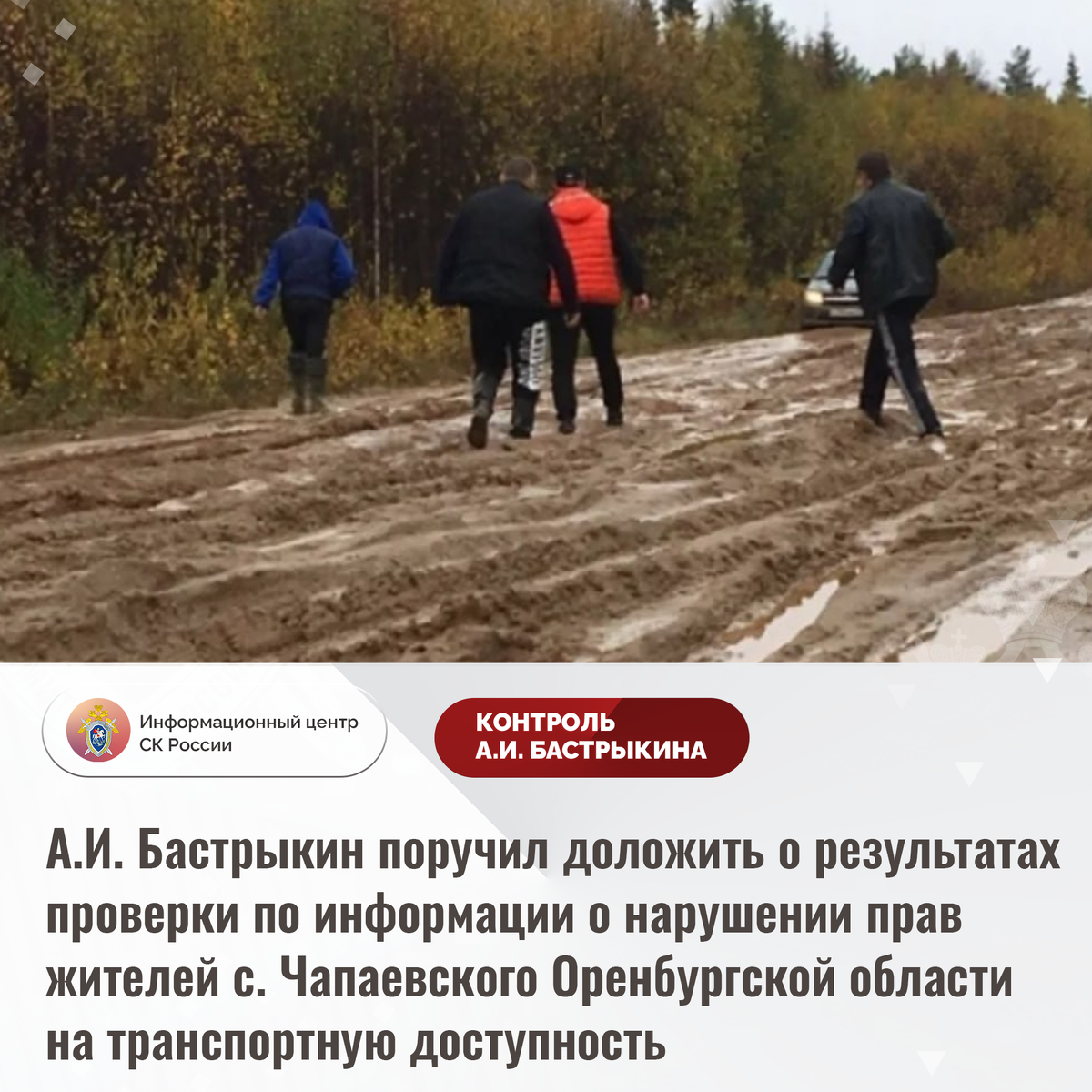 А.И. Бастрыкин поручил доложить о результатах проверки по информации о нарушении прав жителей с. Чапаевского Оренбургской области на транспортную доступность В сети Интернет сообщается о ненадлежащей транспортной инфраструктуре в селе Чапаевском Оренбургской области. Единственная дорога в населенном пункте не асфальтирована, в период осадков грунтовое полотно размывает. В результате в текущем году школьный автобус не смог проехать и доставить детей в образовательное учреждение на экзамен, транспортное средство эвакуировали спасатели. Многочисленные обращения граждан в компетентные органы результатов не принесли, мер к организации проведения ремонтных работ не принимается. В СУ СК России по Оренбургской области по данному факту организована процессуальная проверка. Председатель Следственного комитета Российской Федерации Александр Иванович Бастрыкин поручил руководителю СУ СК России по Оренбургской области Вячеславу Давидовичу Зудерману доложить о предварительных и окончательных резуль