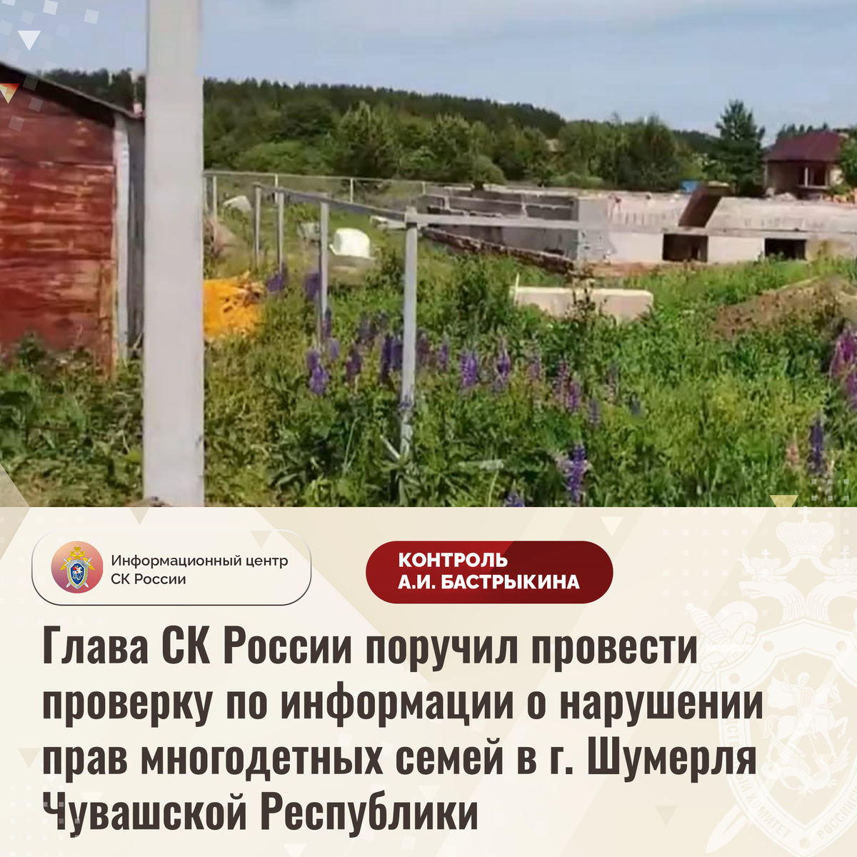 Глава СК России поручил провести проверку по информации о нарушении прав многодетных семей в г. Шумерля Чувашской Республики В социальной сети сообщается о нарушении прав более 20 многодетных семей из города Шумерля Чувашской Республики. В 2018 году льготной категории граждан предоставлены земельные участки, к которым не подведены коммуникации. Несмотря на то, что суд в 2023 году обязал местную администрацию устранить нарушения, до настоящего времени решение не исполнено, в связи с чем местные жители не могут реализовать свои права. Председатель Следственного комитета Российской Федерации Александр Иванович Бастрыкин поручил руководителю СУ СК России по Чувашской Республике Александру Владимировичу Полтинину провести процессуальную проверку и представить доклад об установленных в ходе первоначальных проверочных мероприятий обстоятельствах, а по завершении проверки – о ее результатах. Исполнение поручения, а также ход процессуальной проверки поставлены на контроль в центральном аппарат