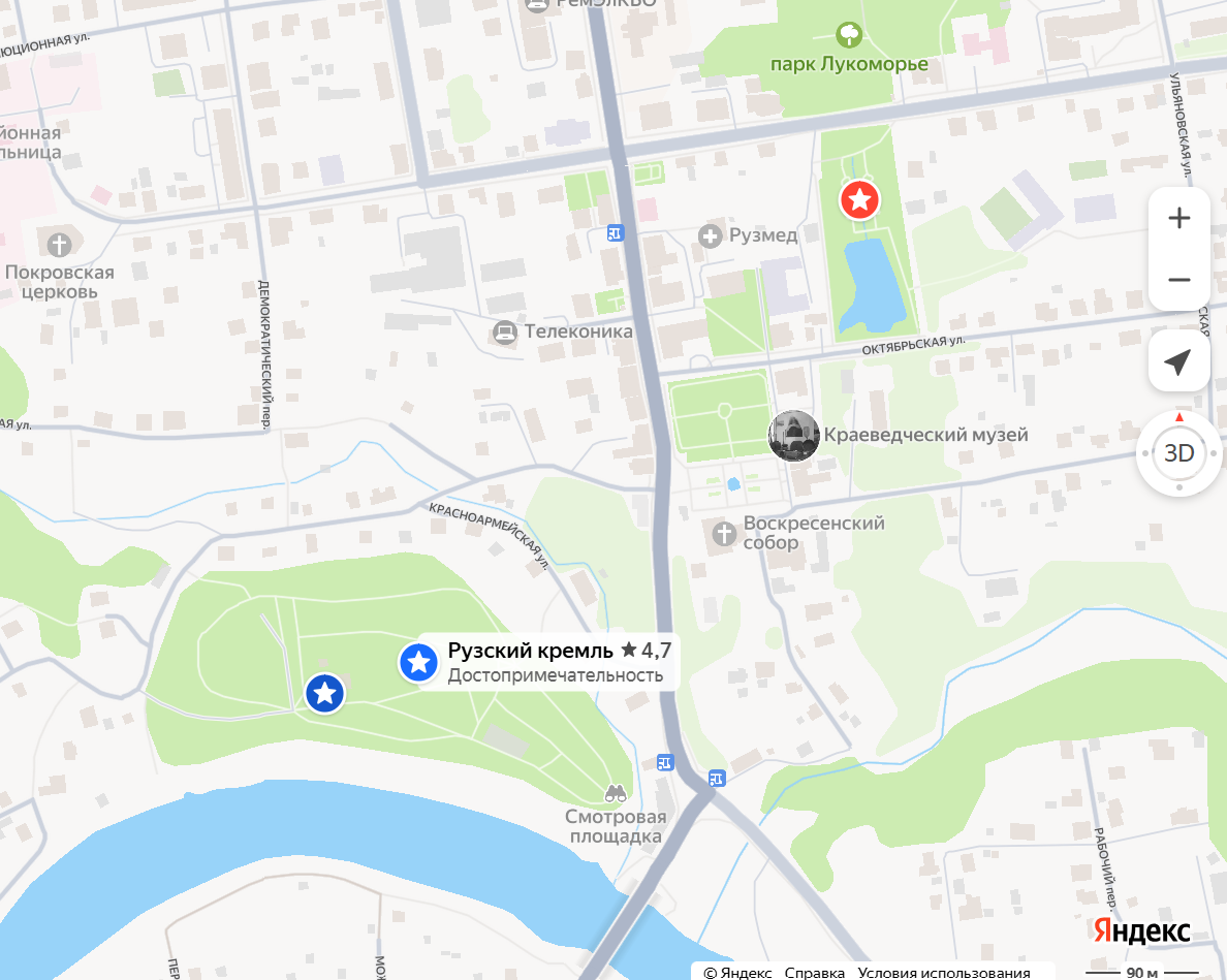 Руза – небольшой городок в Московской области. Старинный. Еще при Дмитрии Донском основан. Город-крепость. Поехали туда по двум причинам. Во- первых, пообедать. Во- вторых, на знаменитый рузский кремль посмотреть. Если в Яндекс- картах «достопримечательности» забить- не так уж много чего выскочит. В годы войны Руза меньше 3-х месяцев был у фашистов в оккупации. С 25 октября 1941 по 17 января 1942 года. Но многие здания были разрушены. А вот кремль, если Яндексу верить, стоит. Остановились у площади Партизан. Бывшей Воскресенской. По имени стоящего здесь собора. Воскресенский собор возвели 1721 году. Якобы указу Петра. В 1925 г. собор закрыли, колокола сбросили, колокольню разобрали, главки на соборе снесли. Получилась детская спортивная школа. В 2009 году собор возвращён верующим, отремонтирован, проводятся богослужения. Когда-то площадь базарной была. Сейчас фонтан соорудили. За фонтаном- ряд административных зданий первой половины XIX века. В глубине еще один домик XIX века спрятал
