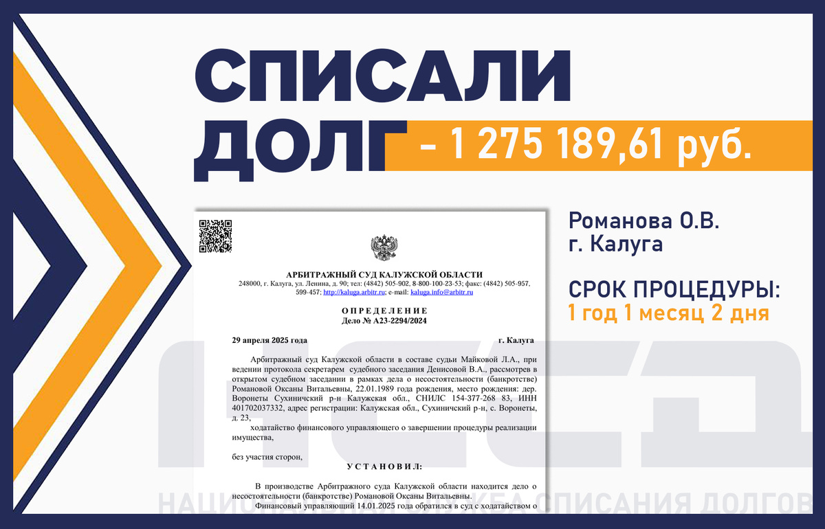 Нас ждет короткая рабочая неделя, а еще одного человека ждет счастливая жизнь, свободная от долгов 🎉 Романова Оксана Витальевна больше не должна 1 275 189 рублей. Номер дела: А23-2294/2024 Город: Калуга Арбитражный управляющий: Поярков А.А. Судья: Майкова Л.А. Процесс: реализация Кредиторы: ООО МФК "Мани Мен", ПАО "МТС-Банк", ПАО Сбербанк Для Оксаны и еще сотни завершивших процедуру клиентов весна 2025 года стала поистине временем обновления 🥰 Мы можем также и для вас! 📌 Бесплатная консультация по банкротству. Наши юристы ответят каждому и подберут индивидуальное решение вашей проблемы. ИНТЕРЕСНЫЕ СТАТЬИ И ВИДЕО: КАК ЗАЩИТИТЬ СЕБЯ ОТ МОШЕННИКОВ | САМОЗАПРЕТ НА КРЕДИТЫ Финансовые пирамиды 21 века Черный коллектор раскрывает методы давления на должников ВНИМАНИЕ, КОЛЛЕКТОРЫ! Как разговаривать с кредиторами и коллекторами, и на что они способны? Как узнать свою кредитную историю через Госуслуги ВНИМАНИЕ! Новые схемы мошенничества. Часть 1 Зачем идут в банкротство люди без долгов? Кто п