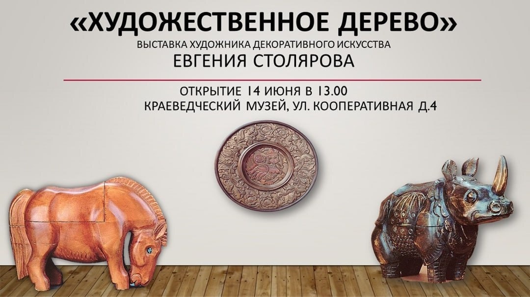 Дорогие друзья, приглашаем в Районный краеведческий музей на открытие выставки «Художественное дерево» художника - декоративиста Евгения Столярова. На выставке будут представлены анималистические скульптуры, декоративные рельефы, блюда и другие виды резьбы. Евгений Столяров занимает свое особое место в пространстве калужского изобразительного искусства. 57 лет он работает в области «художественного дерева». Выставка работает до 31 июля в краеведческом музее по адресу г. Кондрово, ул. Кооперативная, д. 4 Вход свободный.