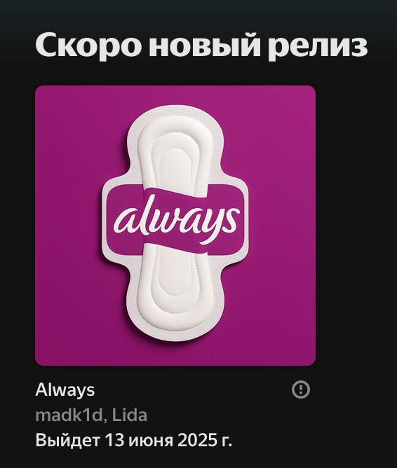 В ответ на пост 🎵 В Яндекс.Музыке появился пресейв и обложка совместного трека madk1d и Lida «Always» Трек выйдет на площадках в эту пятницу — 13 июня. @mainstreamusic
