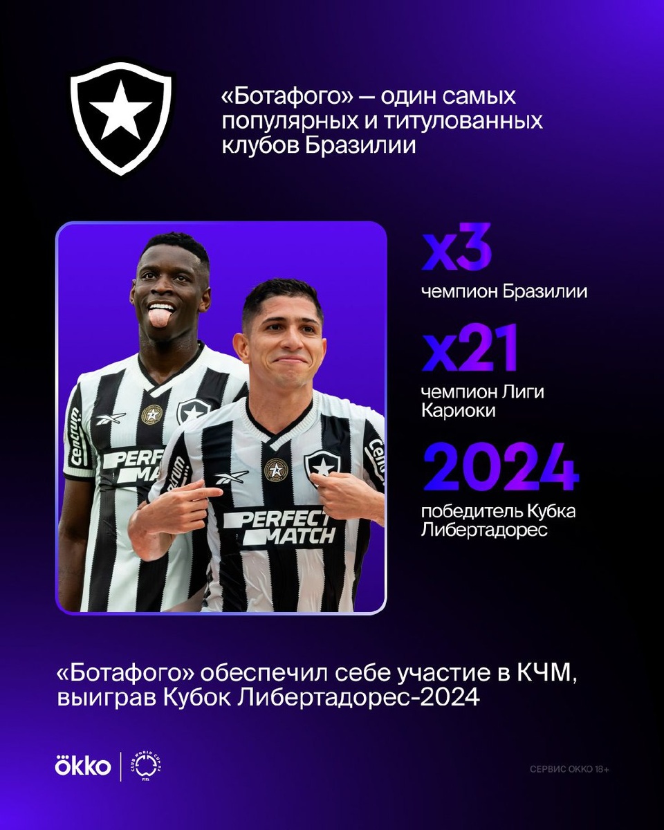 С «ПСЖ» и «Атлетико» за победу в группе поборется и бразильский «Ботафого». Клуб дебютирует на КЧМ благодаря победе в Кубке Либертадорес. Победители главного европейского и главного южноамериканского кубка в одной группе — 🔥