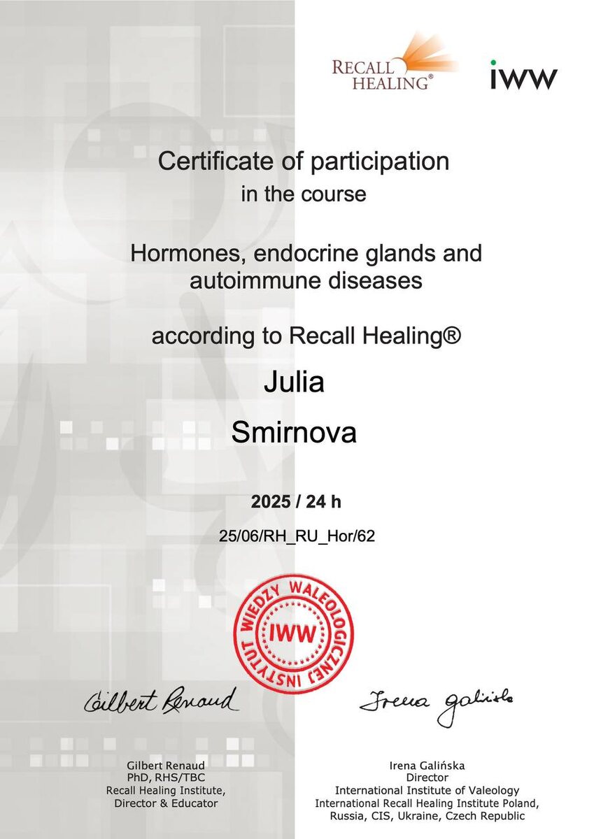 Сегодня мне прислали диплом за участие в семинаре Recall Healing «Гормоны, эндокринные железы и аутоиммуные заболевания».