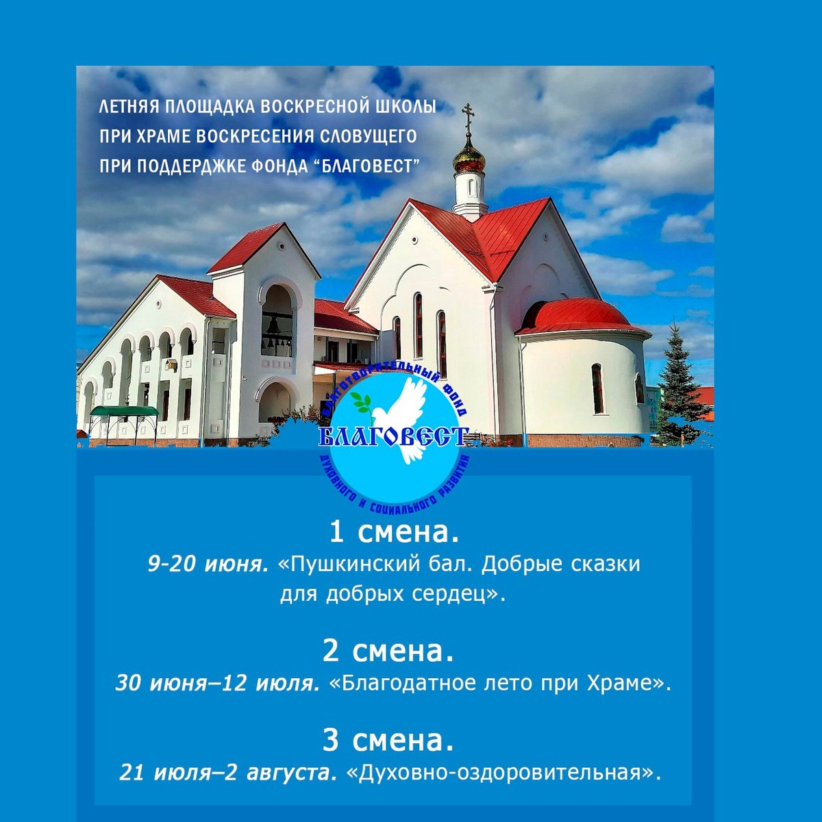 Летняя площадка для детей при Воскресенском храме с. Ягодное: Пушкинский бал, добрые сказки и духовные беседы Приход в честь Воскресения словущего с. Ягодное приглашает юных друзей на летнюю площадку воскресной школы – увлекательное путешествие в мир поэзии, сказок, истории и православных ценностей. 1 смена: 9 –20 июня, 2 смена: 30 июня – 12 июля, 3 смена: 21 июля – 2 августа. Подробнее: https://tltepar.ru/anonsy/sobytiy/letnyaya-ploshchadka-dlya-detey-pri-voskresenskom-khrame-s-yagodnoe-pushkinskiy-bal-dobrye-skazki-i-.html