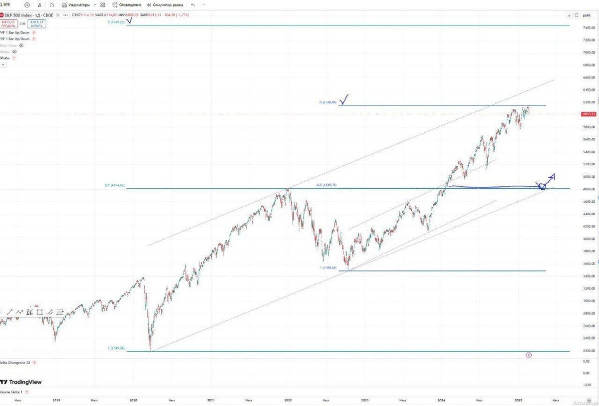 Немного о точности тех технических приёмов, которые я использую в торговле — а как следствие, и о точности прогнозов, которые публикую в своём канале. Представляю два графика: это SP500. Первый был опубликован ещё в феврале — можно почитать тут. Как только цена отработала модель, это стало правильным местом для ожидания снижения. Уровень на котором прежполагалось возобновление я обозначил зелёной траекторией. На втором графике — результат - график сегодня. Что нас ждёт дальше? Не знаю, что вас ждёт 😀, но как трейдер я вижу цель по SP на уровне 7500 — и там я закрою все свои позиции в крипте. Кстати, в том же посте можно почитать, что я тогда ждал по снижению биткойна. Спойлер - 73- 74. Глобально про биткойн было тут. Требую публичного признания своей гениальности😀😀, не стесняйтесь в реакциях!