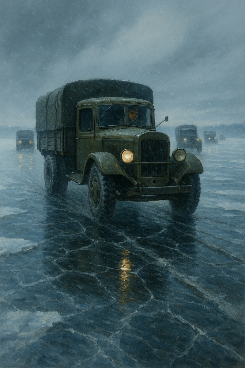 Представь: зима, минус сорок, пурга, всё белое. Перед тобой — озеро Ладога. По нему ползут грузовики. Везут хлеб, соль, муку. А под колёсами — не асфальт, а лёд. Скрипит, стонет. Под ним — бездна. Шаг влево — и смерть. Но назад — нельзя. Там, в городе, умирают дети. Сидит в кабине мужик. Обычный. С натруженными руками, в валенках, без сна и еды. Он не генерал. Не герой кино. Он просто везёт хлеб. Через ледяной ад. Потому что если не он — никто. Каждая поездка — как в последний раз. Но он едет. Потому что в городе мама ждёт кусочек хлеба для ребёнка. Машины тонули. Люди уходили под лёд навсегда. Кто-то задыхался в воде. Кто-то замерзал насмерть в кабине. А колонна всё равно шла. Некогда было плакать. Некогда было бояться. Некому было рассказывать. Просто ехали. Молча. Никаких фанфар. Никаких лент. Вернулся — молодец. Не вернулся — тоже молчат. Многие не дождались похорон. Многие так и остались в Ладоге. Подо льдом. Только подумай: Хлеб, который спас детей — был в этих мешках. Кажд