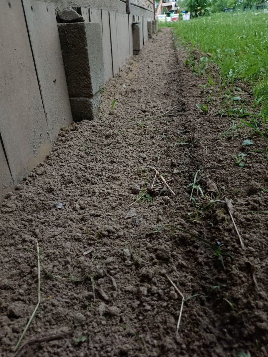 Прорыхлил и выровнял линию возле дома. У кого-то тут обычно отмостка. У меня её нет. Сюда ставлю горшки с цветами. Как раз дождик пусть пролёт, с крыши капель сойдёт, и укажет мне, правильно ли я линию прочертил.