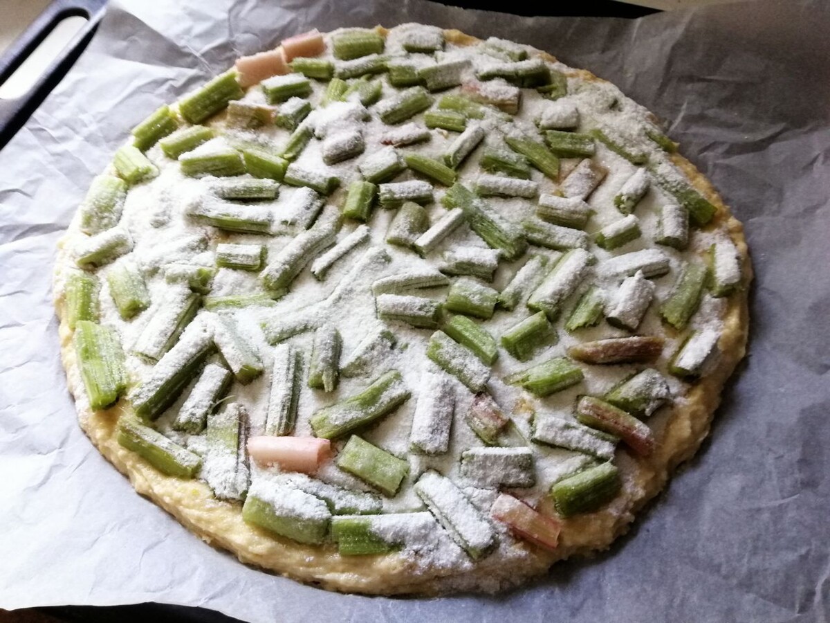 Праздничный 🥧 открытый пирог с ревенем Румяная корочка отлично сочетается с кисловатой начинкой. 🍴Ингредиенты для теста • Мука пшеничная — 300 г • Сахар — 100 г • Соль — 1 щепотка • Разрыхлитель — 1 ч.л. • Сливочное масло — 50 г • Яйцо — 1 шт • Йогурт — 120 г или немного кефира 🍴Ингредиенты для начинки • Ревень — 300 г • Сахар — 3–4 ст.л. • Крахмал — 2 ст.л. • Мята, сахарная пудра 📝 Приготовление 1. Муку соединяем с сахаром, солью и разрыхлителем. Добавим мелко порезанное масло и разотрем. 2․ В мучную смесь разбиваем яйцо и влеваем йогурт или кефир. Замешиваем тесто. 3․ Раскатав тесто, выкладываем на застеленный пергаментом противень. 4․ Ревень очистив, нарезаем на кусочки и выложим на тесто, отступая от края на несколько сантиметров. Сверху посыпаем смесью из сахара и крахмала. 5․ можно завернуть края теста по направлению к центру и немного защипнуть, чтобы они держались. 6․ Выпекаем пирог примерно 30-35 минут при температуре 180 °С. 7. Посыпаем пирог сахарной пудрой и