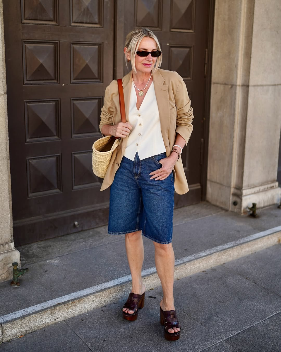 По-настоящему стильные женщины любого возраста, свободные от предрассудков, не избегают модных "молодежных" вещей, а умело их включают в свой гардероб. Например, бермуды. Пока одни считают их атрибутом молодежного расслабленного стиля или загородного отдыха, другие смело вписывают их в шикарный городской гардероб. Ключ к успеху – в правильной длине. Шорты-бермуды, закрывающие бедра до самого колена – это модная индульгенция на лето 2025. Они решают сразу две задачи: скрывают то, что не хочется показывать,а также создают прямую вертикаль и визуально вытягивают силуэт, особенно если выбрать модель со стрелками и правильно подобрать обувь. Давайте разберем 8 наглядных примеров, как носить бермуды, чтобы ловить восхищенные взгляды. Начнем с классики, идеальной для переменчивой летней погоды. Основа образа — сочетание джинсовых бермудов и лаконичного белого жилета. Уже само по себе это смотрится свежо и стильно. А легкий бежевый жакет, который можно накинуть прохладным утром, вечером или в