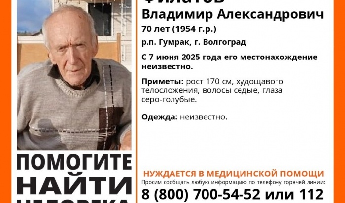 Волонтеры присоединились к поискам пропавшего Владимира Филатова. В Волгограде в р. п. Гумрак пропал 70-летний пенсионер Владимир Филатов. О его местонахождении ничего не известно с 7 июня текущего года. Волонтеры присоединились к поискам. Согласно приметам, указанным ПСО «ЛизаАлерт», рост пропавшего составляет 170 см, у него худощавое телосложение, седые волосы и серо-голубые глаза. Неизвестно, во что был одет мужчина в день исчезновения. Всех, кто знает что-либо о местонахождении пенсионера, просят позвонить по телефону 8 (800) 700-54-52 или 112.