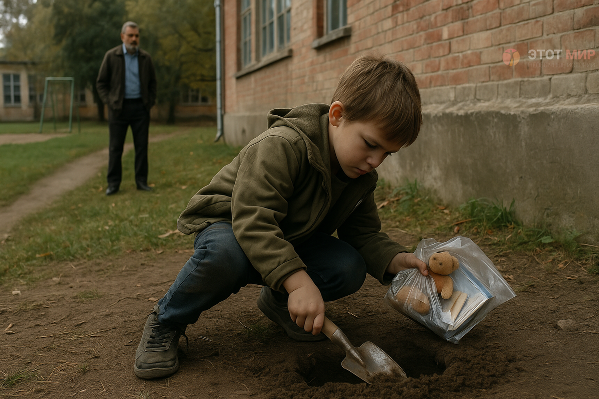 Однажды Иван не выдержал. Когда дети ушли в классы, он вышел к тому месту. Копнул совком. Осторожно, как будто боялся потревожить чей-то сон, и нашёл пакет. Внутри — плюшевый медвежонок, фотография молодой женщины и смятая десятирублёвая купюра.
