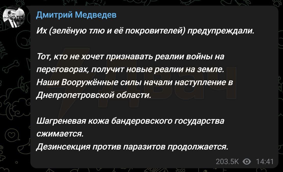 Российские войска начали наступление в Днепропетровской области: Медведев заявил, что «зелёную тлю и её покровителей» предупреждали Russische Truppen starteten eine Offensive in der Region Dnepropetrowsk: Medwedew sagte, die "grünen Blattläuse und ihre Gönner" seien gewarnt worden