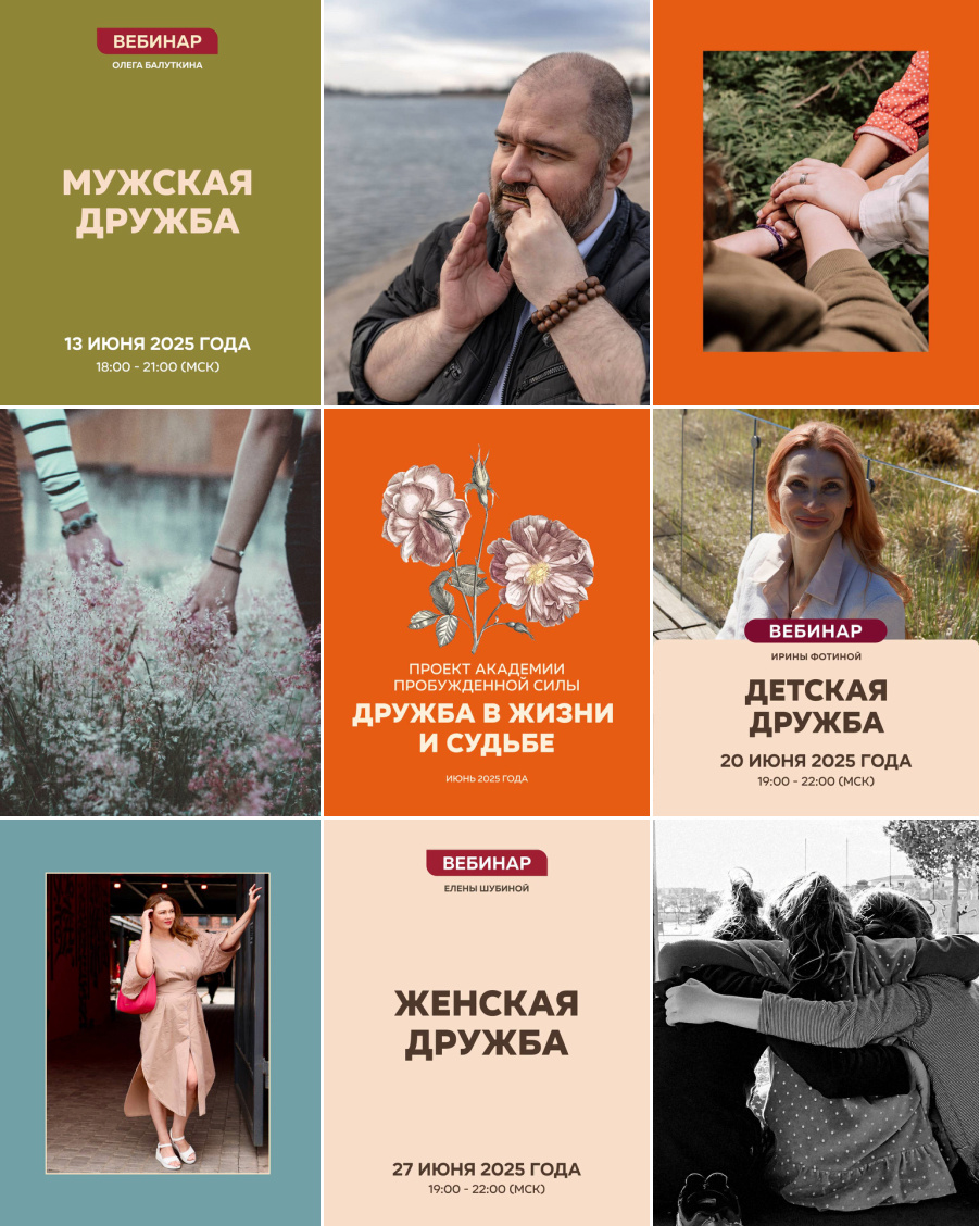 ДРУЖБА В ЖИЗНИ И СУДЬБЕ Психологический проект Академии Пробужденной Силы Дружба входит в список базовых потребностей человека. Без друзей трудно, хотя и возможно. Но нужно ли? А ещё, именно из опыта дружбы, который мы получаем в своём детстве, в семье, от родителей, от народа, к которому принадлежим или рядом с которым живём, мы получаем знание о природе и характере человека. Именно в дружбе мы учимся доверять, выражать свои мысли и желания, выстраивать границы и прощать. Люди по-разному относятся к дружбе. Кто-то переоценивает её и от этого постоянно сталкивается с предательством. Кто-то, наоборот, недооценивает и потому недополучает человеческой поддержки. Мы — специалисты Академии, решили всесторонне исследовать эту тему и предлагаем вам сделать это вместе с нами. На больших трёхчасовых вебинарах, с возможностью общаться с преподавателем, с чат-поддержкой в Telegram и бессрочным доступом к записям. Присоединяйтесь! 1⃣МУЖСКАЯ ДРУЖБА Вебинар Олега Балуткина⠀ 📆 13 июня 18:00–21