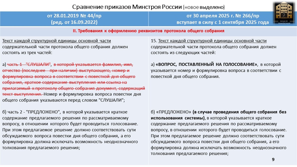Друзья, как и обещал, публикую вторую часть сравнительной таблицы, где сопоставляем действующие и новые требования к оформлению протоколов общих собраний собственников (ОСС). ⚠️ Помните, что новые правила вступают в силу с 1 сентября 2025 года #жилищноеправо #протоколыОСС #Минстрой #законодательство #ЖКХ #приказ266/пр Следите за обновлениями – скоро опубликую третью часть сравнительного анализа! Подписывайтесь на мои телеграмм и youtube каналы, чтобы быть в курсе актуальных вопросов ЖКХ. В телеграмм-канале бесплатная консультация только для подписчиков в комментариях под постами.