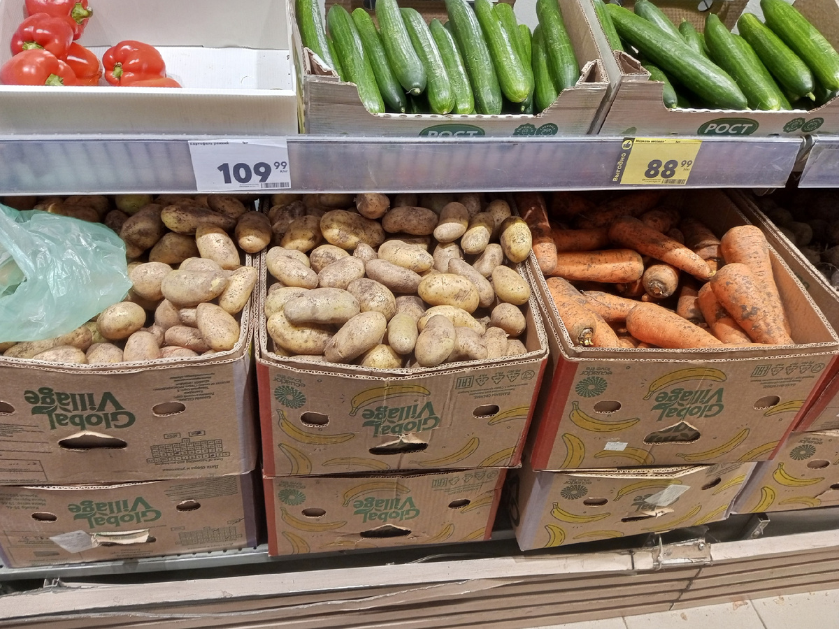 Как-то я сетовала на то, что бананы слишком дорогие и из ежедневной покупки они перешли к тем, что бывают иногда, но вот который раз я уже думаю о картошке. В первый раз, когда пошла покупать ее, не посмотрела на цену, потом очень удивилась, заметив в чеке стоимость в 100 рублей, в этот раз уже специально обратила внимание - все по-прежнему, 109 рублей за килограмм. Что же, любопытно, ровно как и морковь за 88, хотя эти овощи всегда считала самыми недорогими из всех.