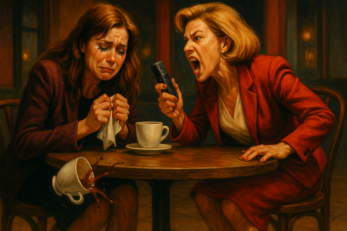 Чашка кофе выскользнула из моих пальцев и с драматичным «ДЗЫНЬ!» разлетелась на куски, забрызгав мои новые туфли коричневыми каплями. Но мне было наплевать, я уже вцепилась в диктофон размером с губную помаду и нажимала кнопку записи. Передо мной разворачивалась сцена, достойная шекспировской трагедии, моя обычно невозмутимая подруга Маша рыдала так, будто небо падало на землю, одновременно пытаясь уничтожить пачку салфеток и свой макияж.