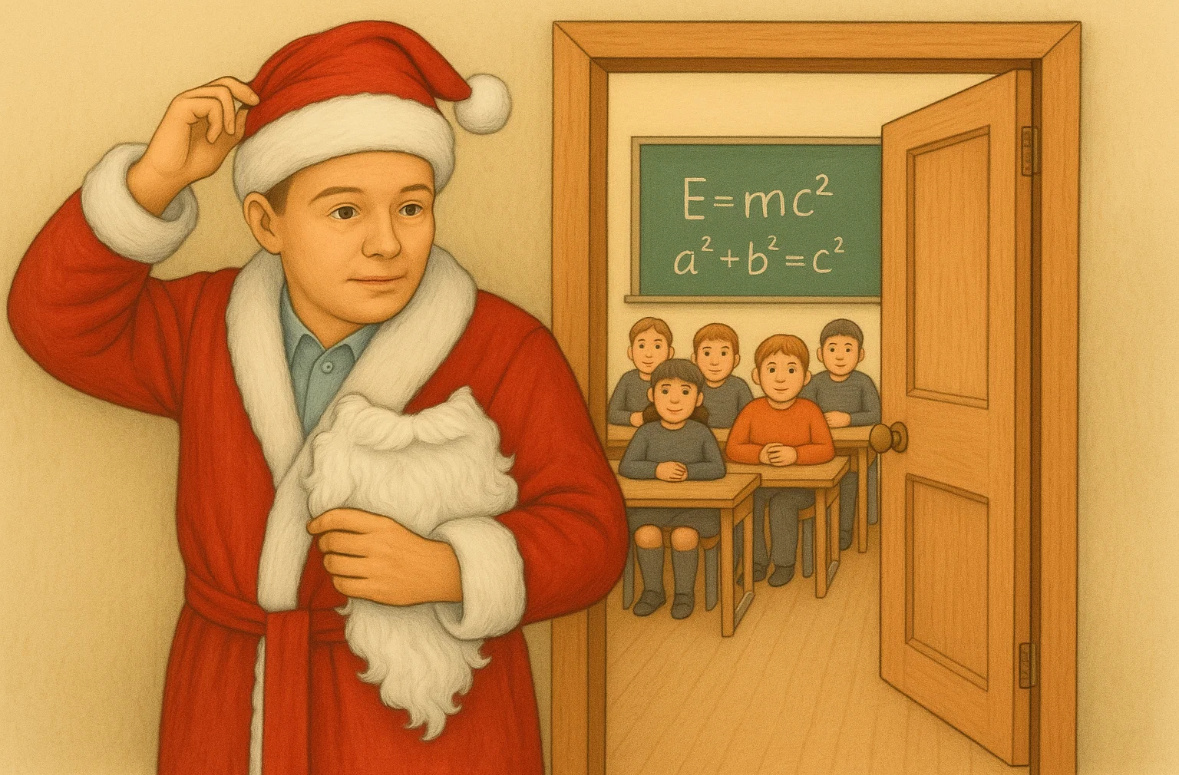 Быть учителем математики — это не только уравнения, графики и теоремы. Это ещё и возможность создавать моменты, которые ученики запомнят надолго. Особенно перед Новым годом, когда даже самые серьёзные старшеклассники украдкой ждут чего-то волшебного. Меня зовут Владислав Эдуардович, и вот уже несколько лет я, взрослый мужчина и преподаватель точных наук, устраиваю своим ученикам необычный сюрприз. Год второй: рождение идеи и первый восторг Это был мой второй год преподавания. До каникул оставалась пара дней, а душа просила чего-то большего, чем просто последний урок. Захотелось подарить детям немного праздника. В голову пришла простая идея: появиться на уроке в костюме Деда Мороза. Не просто надеть шапку, а сделать всё «по-серьезному»: борода, шуба, посох. План был почти театральный. Начинаю урок как обычно — строго, по делу. Потом нахожу повод выйти из класса. Через пару минут возвращаюсь... уже в полном костюме Деда Мороза. С музыкой, мешком с конфетами и настроением. Раздаю подарки