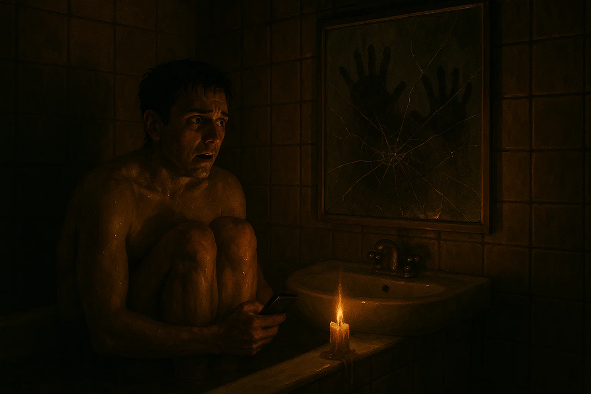 Паника ударила, как молния. Я выскочил из душа, поскользнувшись на мокрой плитке, и с грохотом рухнул на пол, больно ударившись затылком. В глазах заплясали искры, но страх был сильнее боли. Я рванулся к двери ванной, захлопнул её и щёлкнул задвижкой. Сердце колотилось так, будто хотело вырваться из груди. Я забрался в ванну, подтянул колени к подбородку и замер, сжимая телефон в руке. Свеча всё ещё горела, и её слабый свет отражался в зеркале над раковиной.