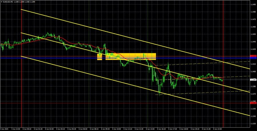 https://basechop.ru/wordpress/?p=45362 Анализ EUR/USD 5M. Валютная пара EUR/USD в течение пятницы продолжала не самое сильное падение и к концу дня оказалась около уже всем знакомой восходящей линии тренда. Напомним, что примерно 10 дней назад эта линия была преодолена, что указывало на завершение восходящей тенденции. Однако фундаментальный фон, касающийся торговых перипетий Трампа и всего остального мира, вновь оказал сильное давление на доллар США, и пара возобновила рост. Сейчас мы вновь можем столкнуться с чем-то подобным. В пятницу макроэкономический фон действительно поддержал продавцов, так как отчеты NonFarm Payrolls и уровень безработицы «сильными» не назовешь, но и провальными они не были. Скорее, они показали средние значения, на которые и рассчитывали трейдеры. Однако в текущих обстоятельствах, когда экономика США может замедляться, благодаря пошлинам Трампа, от показателей рынка труда можно было ждать и худших значений. Сколько на этот раз будет расти доллар, если в Шта