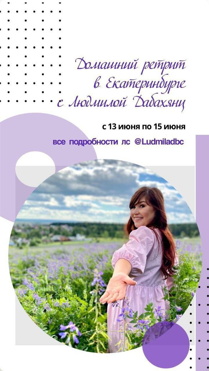 Ну, что, дорогие мои, уже совсем скоро встречаемся в Екатеринбурге. Подробности и запись t.me/Ludmiladbc Домашний ретрит выходного дня с Людмилой Дабахянц Адрес: Свердловская область Сысертский район Пос Октябрьский на территории частного дома. ~ 13 июня с 16:00 встреча участников, знакомство, открытие поля, взаимодействие, совместный ужин ~ 14 июня групповая терапевтическая работа по личным запросам участников в течение всего дня с перерывами на отдых, завтрак, обед, ужин и радости жизни ~ 15 июня обратная связь, ответы на вопросы, закрытие поля, завтрак, выезд **По желанию вы можете участвовать любое количество дней. ** еду готовим сами ** чтобы сориентироваться по возможному размещению на ночь пишите Наталье 89221811738, @tashabe_life подскажет адреса гостевых домов и цены на проживание. ** предоплата за участие 3000 рублей по номеру телефона 89635514949 на Т-банк с комментарием "ЕДА" ** оставшаяся сумма на месте