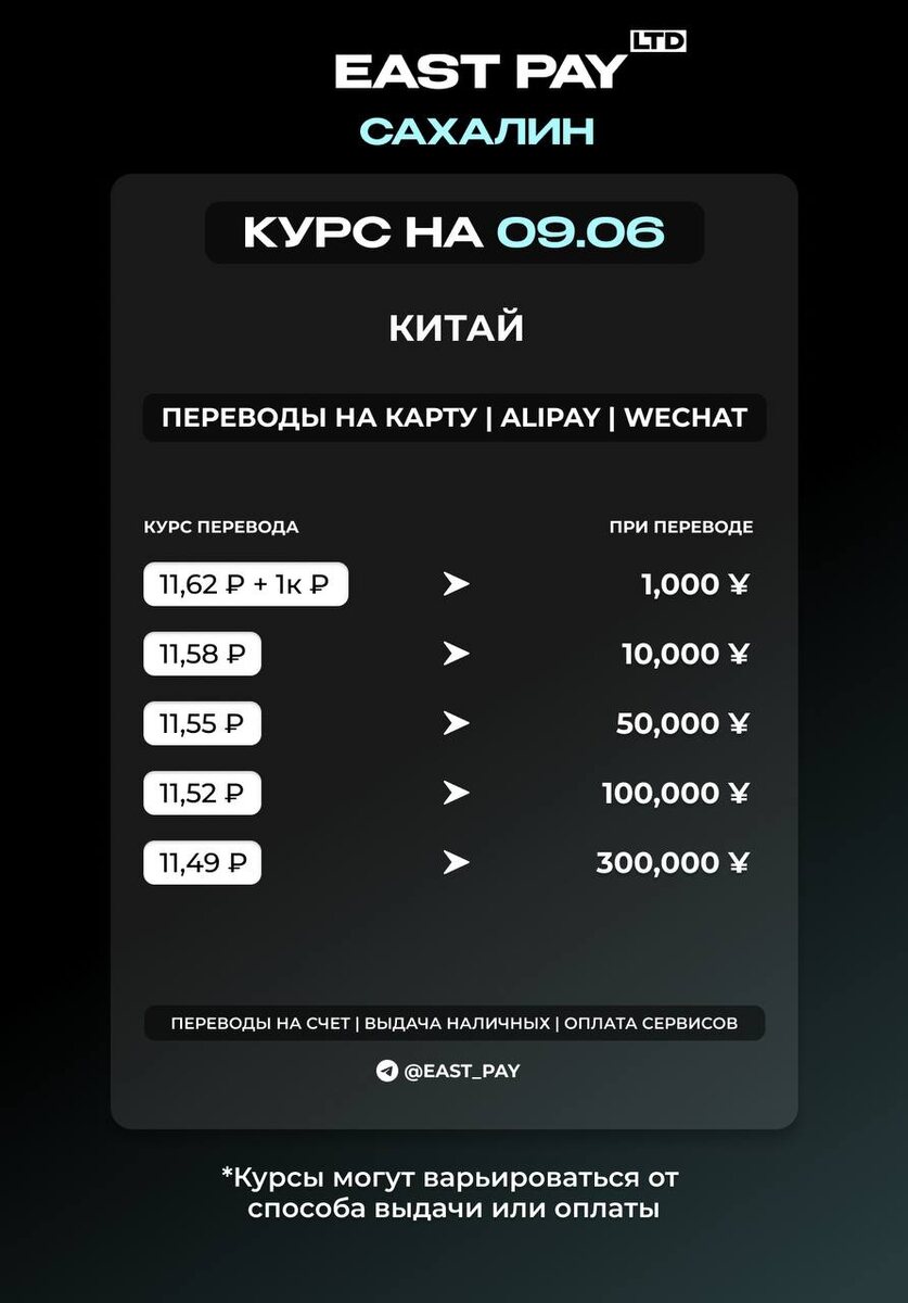 КУРСЫ НА КИТАЙ 💙Переводы на китайскую карту 💙Alipay / Wechat 🔘В течение дня курс может меняться. Рекомендуем уточнять актуальный курс у менеджера. ❗️ВАЖНО: мы получили лицензию и открыли офис в Корее. Подробности можете узнать у менеджера. 🔴🔴🔴🔴🔴🔴🔴🔴🔴🔴 🟠Написать менеджеру: @east_pay_world 🟠Сделать просчет самостоятельно в боте: @East_PaySer_bot ✈️ Подписаться на «East Pay»