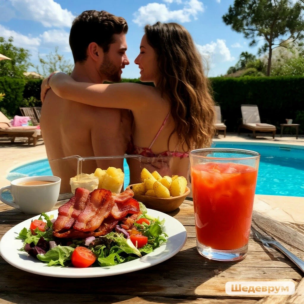 Бассейн, лето, солнце, Шашлык, салатик, сок, Обнялись под оконцем, Упали на песок. Все страсти, слëзы, бури, Всë было кувырком, В той женственной фигуре- Любовь, уют и дом. Картошка, сало, кофе, Салатик винегрет, Балуется любовью Ритмичный силуэт. Автор Антон Власов.