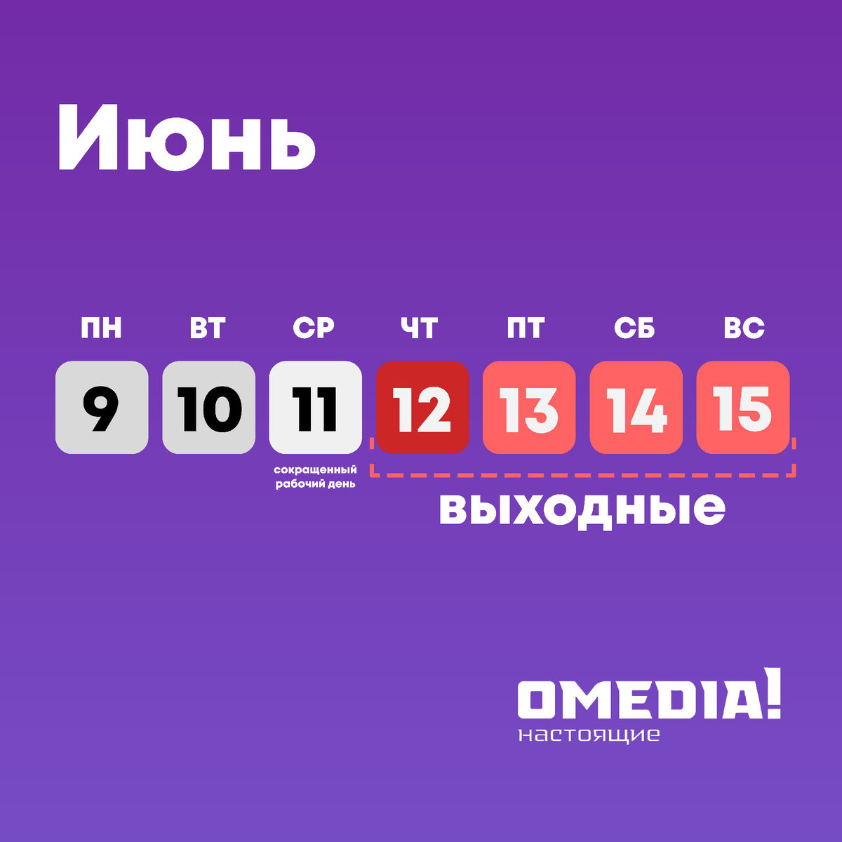 В России стартовала короткая рабочая неделя. Трудиться предстоит 9, 10 и 11 июня, крайний день сокращен на час. В связи с празднованием Дня России, нерабочими считаются дни со 12 по 15 июня включительно. Согласно производственному календарю, на 13 июня был перенесен выходной с 8 марта, который в этом году выпадал на субботу.