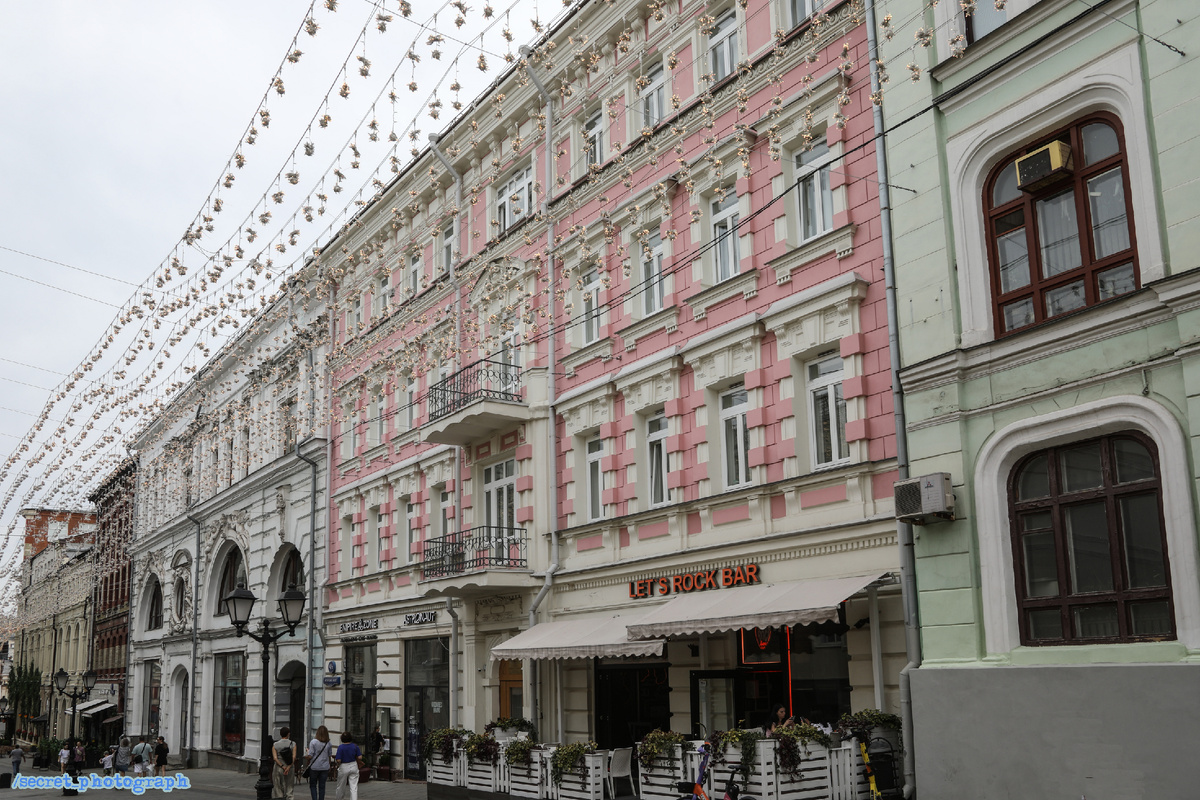 Это уже был накрепко вошедший в моду московский неоклассицизм. Четыре этажа насыщенно розового цвета (утверждают, что именно такой окрас он имел и в день своего «рождения»), с массивными рустованными наличниками окон второго и третьего этажей, тонкой ковки ограждениями балконов и традиционными магазинами на первом.