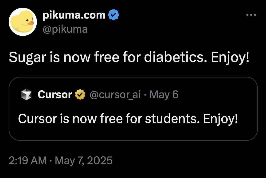 Из комментов предыдущего поста. Кстати тема с ИИ инструментами получила живую дискуссию в комментариях, что вроде как ожидаемо, но при этом неожиданно учитывая в целом обычно спокойные реакции в этом канале) А вы считаете что с появлением Cursor (для разработчиков) или других моделей для видео, аудио, текстов - приведет к тому что следующее поколение просто не будет само ничего уметь? И на ваш взгляд если это будет так, то это в целом приведет к прогрессу или регрессу?