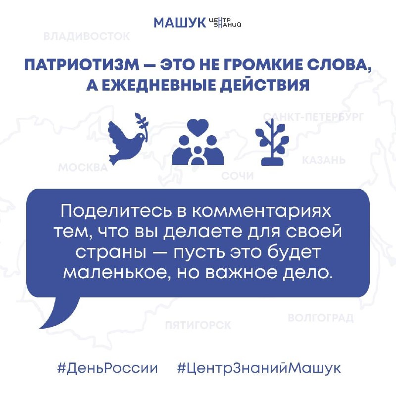 Моя Россия — в моих поступках Каждый из нас — это часть большой страны. И у каждого — своя зона ответственности, своя забота, свой смысл. Не всегда то, что важно, громко звучит. Иногда это просто: посадить дерево, научить добру, поддержать, не пройти мимо. ✏️ Расскажите в комментариях, как через свои поступки вы проявляете любовь к Родине. Лучшие истории мы опубликуем 12 июня.