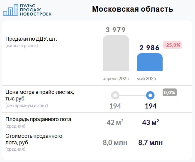 Московская область. Май 2025. Итоги продаж по ДДУ. 🏙 Сделки 2 986 сделки по ДДУ в мае 2025 (-25,0% за месяц). 💰Цены и предложение На конец мая средняя цена метра составила 194 тысячи рублей, как и в предыдущем месяце (без премиум и элит сегментов). На начало июня (на сегодня) средневзвешенная цена метра не изменилась, 194 тысячи рублей. 🔸Цена метра в сделках с ДДУ выросла до 199 тысяч рублей (+9 тыс. рублей, +4,8%). Средний бюджет покупки вырос, в среднем 8,7 млн рублей за лот (+0,7 млн за месяц). Средняя площадь проданного по ДДУ лота в мае - 43 м² (+1 м² за месяц). 📈 Доля ипотечных сделок 73,0% (в апреле было 65,0%). Смотрите детальные графики, топ девелоперов и старты продаж апреля на нашем сайте https://pulsprodaj.ru/news/mai-2025-moskovskaia-oblast/ 🔥 @pulsprodaj