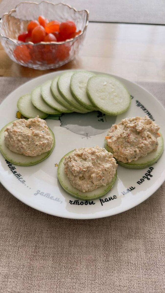 В ответ на пост Сегодня на завтрак новая вариация творога с овощным салатом! 🫑Паштет из творога и печеного перца😋😋😋 Это еще вкуснее! Мужу тоже зашло) но он ел с хлебом, а я люблю со слайсами из кабачка🤗 кто не любит сырые можно обжарить Кто угадает что на втором плане? Напишу в комментариях 🔥если нужен рецепт!