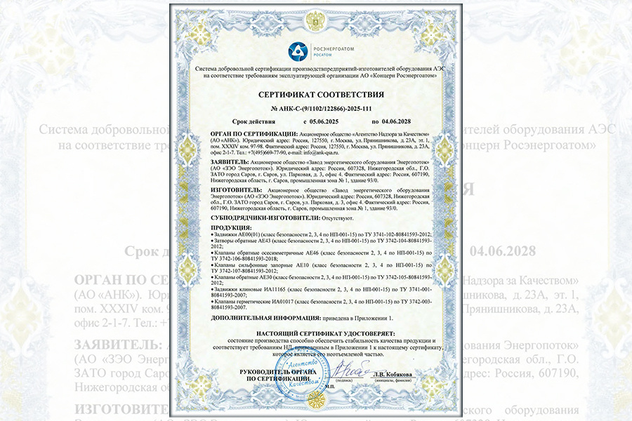 «По результатам проведения сертификации производства АО «ЗЭО Энергопоток» в системе добровольной сертификации предприятий-изготовителей оборудования АЭС на соответствие требованиям эксплуатирующей организации АО «Концерн Росэнергоатом», Органом по сертификации АО «АНК» выдан сертификат соответствия № АНК-С-(9/1102/122866)-2025-111 на изготовление следующей продукции», - отметили в компании. В перечень вошли: