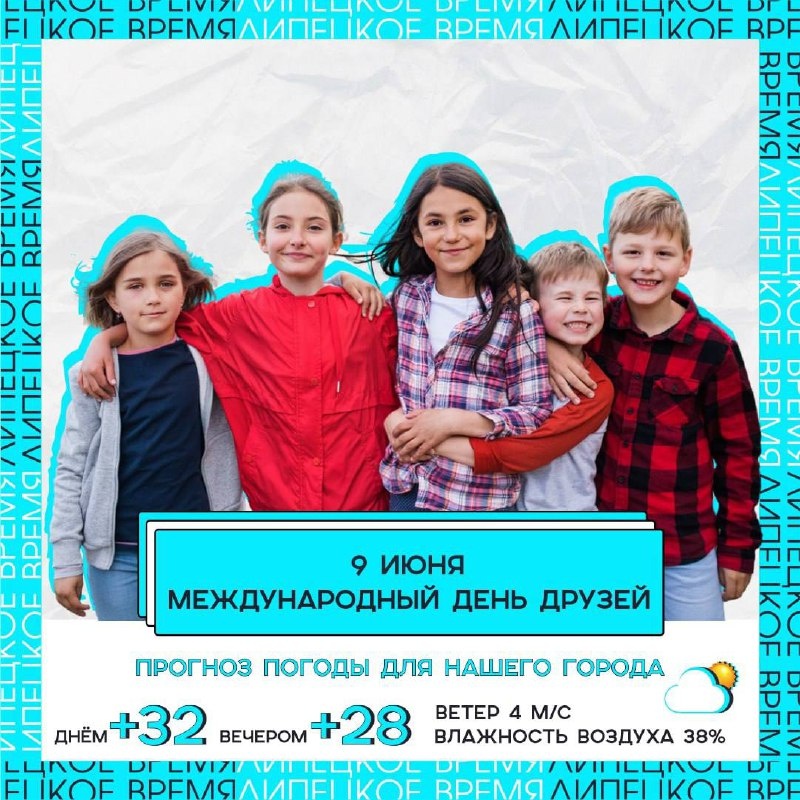 🤝9 июня — Международный День друзей! 🕊 Это неофициальный праздник, но отличный повод написать или позвонить своим близким и напомнить, как они вам важны. ☀️В Липецке сегодня обещают жару до +34 °C и яркое солнце — отличный день для прогулок с друзьями!