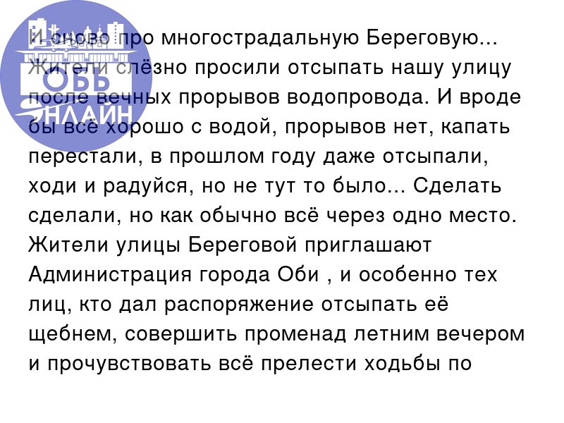 ↗ И сново про многострадальную Береговую... Жители слёзно просили отсыпать нашу улицу после вечных прорывов водопровода. И вроде бы всё хорошо с водой, прорывов нет, капать перестали, в прошлом году даже отсыпали, ходи и радуйся, но не тут то было... Сделать сделали, но как обычно всё через одно место. Жители улицы Береговой приглашают Администрация города Оби , и особенно тех лиц, кто дал распоряжение отсыпать её щебнем, совершить променад летним вечером и прочувствовать всё прелести ходьбы по булыжникам. Сегодня с утра сново проехал грейдер, вопрос к Администрация города Оби , что Вы там всё ровняете!? И так ходить без слез невозможно по этим булыжниками, машины только немного укатают, нет опять грейдер всё перепахает. vk.com Подробнее на https://vk.com/ob.gorod #городобь #городобьонлайн #толмачево