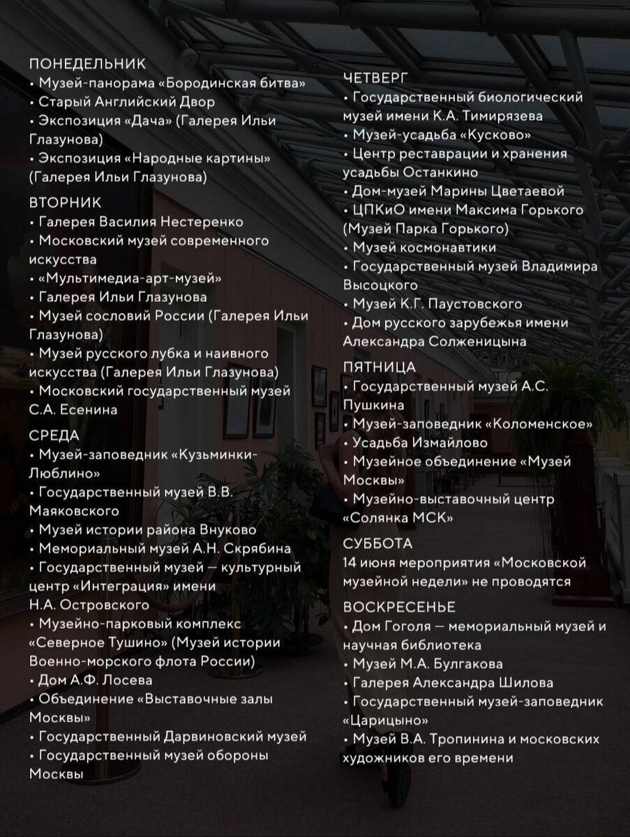 Неделя открытых дверей в музеях В рамках «Московской музейной недели» более 80 музеев и выставочных пространств предоставляют бесплатный вход. От шедевров русского авангарда до ретро-техники и археологии — вас ждёт культурное разнообразие столицы. Билеты можно оформить на mos.ru или на сайте выбраного музея. 🕐 9-15 июня 💵 Бесплатно по предварительной регистрации. #музей #бесплатно Подпишись на Москва до 500+
