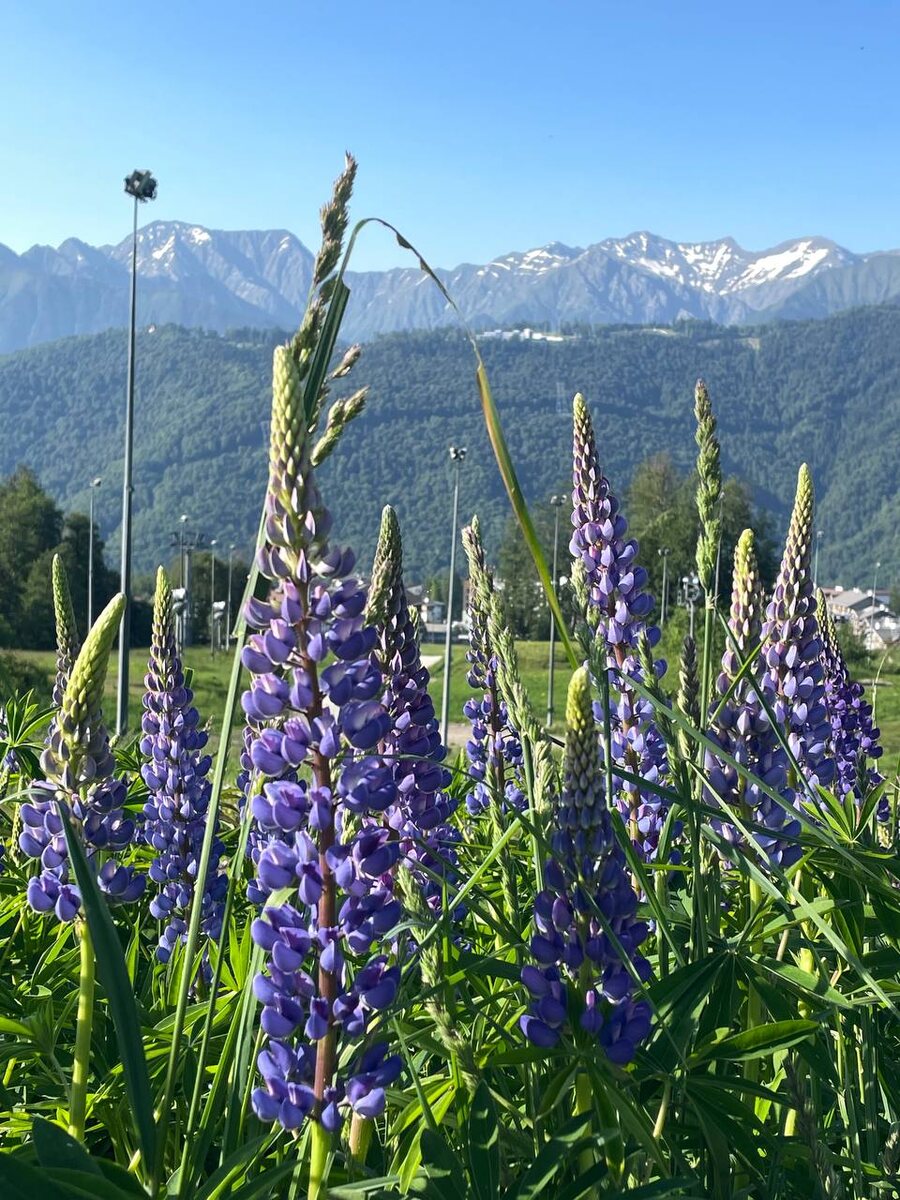 Люпины в горах. Найти их не сложно. Курорт «Роза Хутор». Поднимаетесь в Олимпийскую деревню, я обычно это делаю на авто. Ориентир отель «Роза ски инн», от него идти по дороге в сторону «Роза Шале» буквально 50-100 метров. Люпины растут на тропе Йети, там их больше и через неделю там будет самый сок цветения. Любуйтесь, только очень прошу не вытаптывайте цветы. После некоторых фотосессий плакать хочется больше, чем любоваться цветами