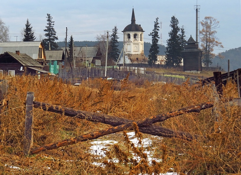 30 километров от Черемхова до Бельска автобус едет минут 40. Но даже в стороне от тракта и Транссиба левобережье Ангары удивительно густо заселено. Деревни стоят если не одна за другой, то в прямой видимости друг от друга, а о том, что так тут не первый век, напоминают крепко сбитые избы, изящные наличники и даже деревянные церкви, как например остов Спасо-Преображенского храма (1876) в селении Верхний Булай.