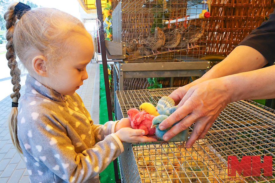 Площадка «Белплемживобъединения» всегда была самой популярной локацией для посетителей с маленькими детьми. В этом году организаторы превзошли сами себя и демонстрируют не только племенных животных, но и разноцветных цыплят — малыши выкрашены в розовый, голубой и салатовый цвета.