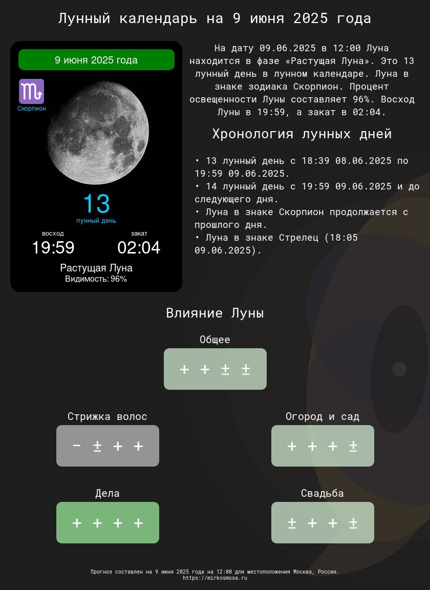 Лунные календари на 9 июня 2025 года: Подготовьтесь к этому дню с учетом влияния Луны! 🔹🌗 Лунный календарь на 9 июня 2025 года — Что приготовила Луна? Подробнее 🔹✂️ Лунный календарь стрижек на 9 июня 2025 года — Подходящий ли день для обновления прически? Подробнее 🔹🌱 Лунный календарь огородника и садовода на 9 июня 2025 года — Лучшее время для ухода за растениями. Подробнее 🔹📅 Лунный календарь дел на 9 июня 2025 года — Удачные моменты для важных задач. Подробнее 🔹💍 Лунный календарь свадеб на 9 июня 2025 года — Подходит ли этот день для вашего торжества? Подробнее