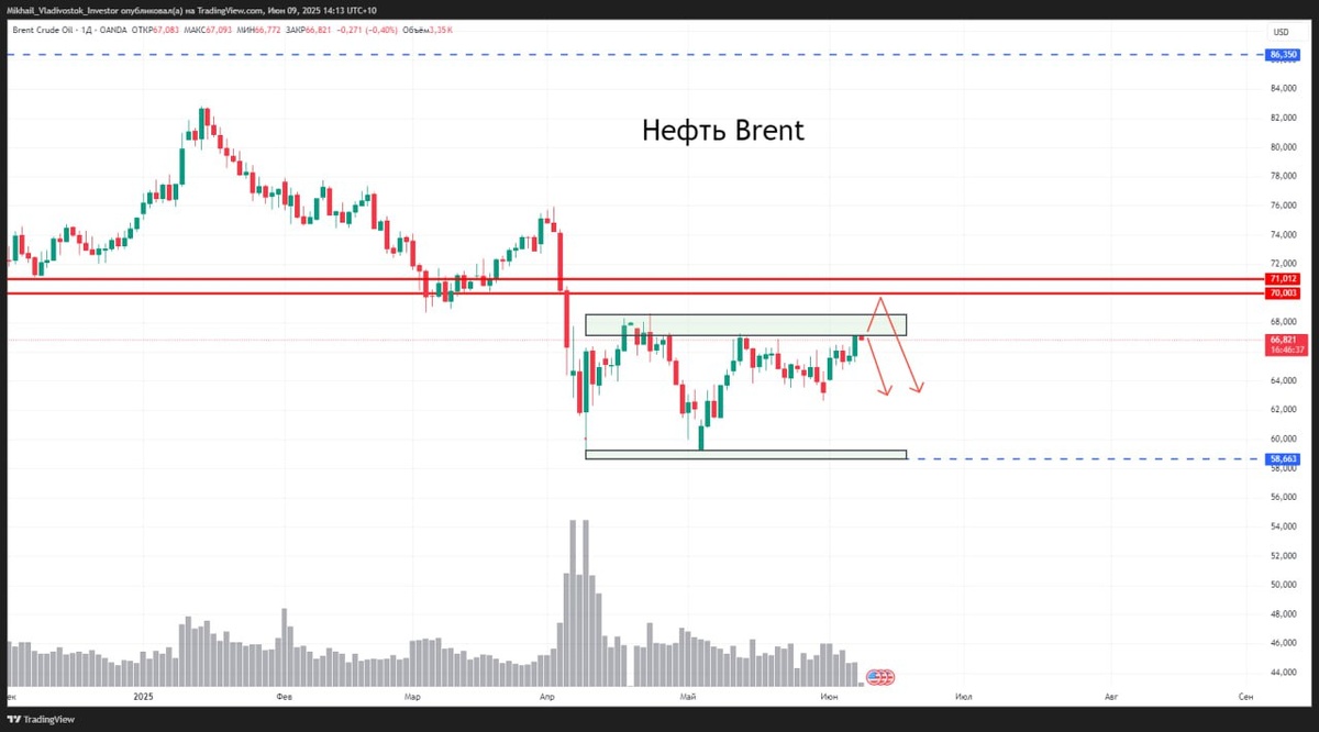 НЕФТЬ Brent $BRM5 Таймфрейм дневной По технике. Расторговывается в широком боковике. Если и торговать, то только в шорт. Желательно от верхней границы боковика. Как показал собственно. Сценарий, что и раньше. ПРИРОДНЫЙ ГАЗ Natural Gas $NGN5 Таймфрейм дневной Максимумы все еще понижаются. Есть спрос покупателя. При этом нет агрессивных продаж, какие были раньше. Для лонга необходимо выходить выше 3,822(максимум ближайший) и закрепляться. Всё показал на картинке. О шортах пока речи не идет. Только если пробьем 3,4. #нефть #газ 🌐 VK | 🤴 YouTube | 😎 Ответы на вопросы | 😎 Курилка-флудилка | 🪙 Канал по крипте