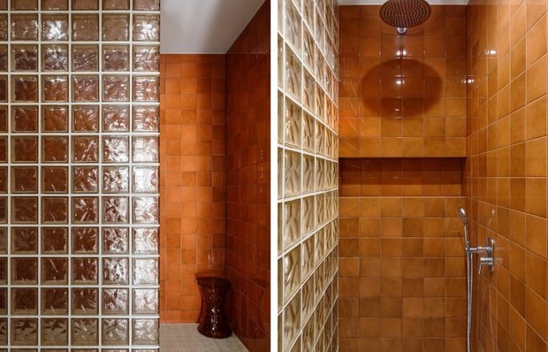 Интерьер этой просторной ванной был продуман до мелочей: от геометрии стен до сочетания материалов и палитры Проект для молодой семьи воплотил все ключевые принципы бюро Collage.Studio — это и нестандартная работа с цветом, и любовь к фактурным материалам, и внимание к деталям. Благодаря удачному планированию ванная получилась не только удобной, но и впечатляющей визуально. Главный акцент помещения — перегородка, собранная из стеклоблоков. Прием не только отсылает к эстетике 80-х, но и решает сразу несколько задач: разделяет зону душевой и раковины, добавляет текстуру и пропускает свет, создавая красивую игру отражений. За стеклоблоками — полноценная душевая ниша, оформленная терракотовой плиткой с мягким глянцем. Насыщенный оттенок согревает и визуально выделяет зону, придавая ей уюта и глубины. Подвесная тумба с раковиной выполнена в таком же кирпично-красном цвете, как и душевая. Ее закругленные формы перекликаются с округлой подвесной лампой, а лаконичные ручки подчеркивают геометр