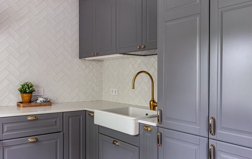 - Фартук выполнен в нейтральных тонах, не перегружая пространство.
